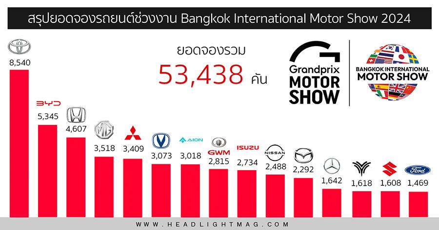 สำหรับยอดจองรถในงาน แบ่งเป็นรถยนต์ 54,513 คัน จักรยานยนต์ 7,982 คัน แบ่งเป็นรถสันดาป (ICE, HEV และ PHEV) จำนวน 58.7% โดยมี Top 3 ได้แก่ Honda, Toyota และ Ford และรถยนต์ไฟฟ้ามีส่วนแบ่งในการจองรถยนต์รวมถึง 41.3% ซึ่งถือเป็นสัดส่วนที่สูงมากเมื่อเทียบกับปี 2023 ซึ่งมียอดขายรถยนต์ไฟฟ้าประมาณ 38.4% มีการเติบโตถึง 7.55% โดยมีแบรนด์ ที่ได้รับความนิยม คือ BYD ครองแชมป์ยอดจองรถยนต์ไฟฟ้าในงานนี้ ตามมาด้วยแบรนด์อื่นๆ เช่น AION, MG และ NETA ซึ่งสะท้อนให้เห็นถึงการเติบโตของแบรนด์รถยนต์ไฟฟ้าจากจีนในตลาดไทย และ แนวโน้มในอนาคต คาดว่ายอดขายรถยนต์ไฟฟ้าในประเทศไทยจะยังคงเติบโตอย่างต่อเนื่องในอนาคต